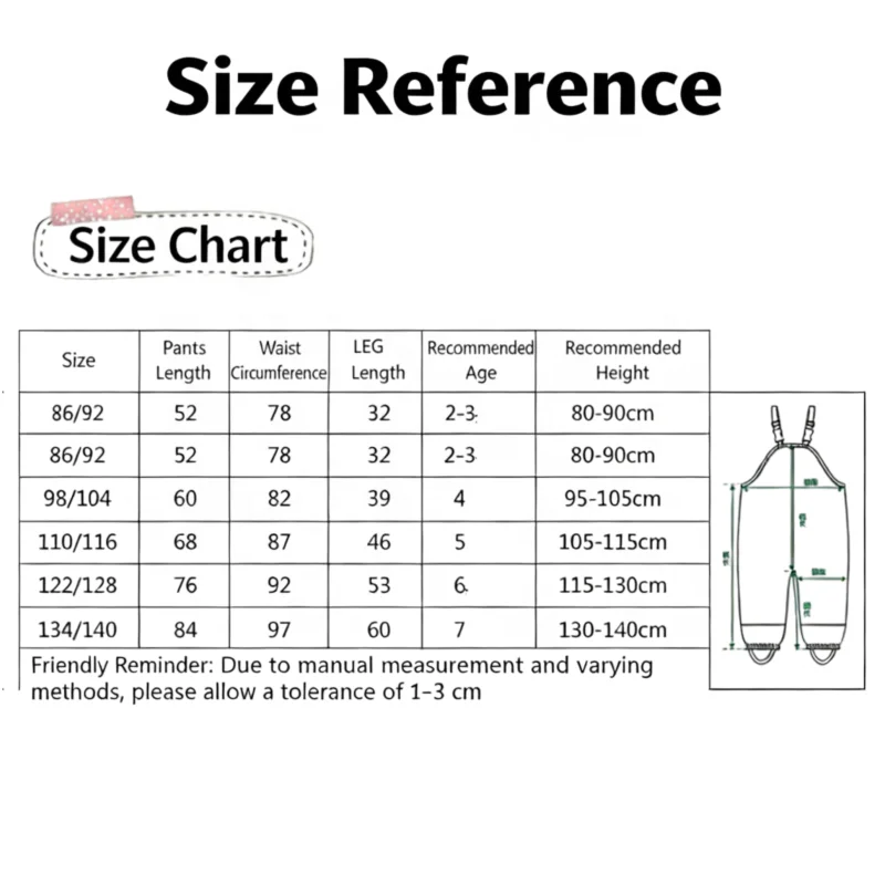Charta méid iomláin le haghaidh cothromaíocht pherfeacht: Ar fáil i méid 86/92 go 134/140, ag covernaois aois 2-7 bliana agus airde 80-140 cm. Tá tomhas mionsonraithe le gach méid: fad na bpantallón (52-84 cm), trácht (78-97 cm), agus fad na gcos (32-60 cm). Cinntíonn an dearadh comhshóraí cothromaíocht thar a bheith dlúth mar a fásann na páistí. Is é seo an rogha is fearr mar Kinder-Regenhose ar mhargaidí idirnáisiúnta.