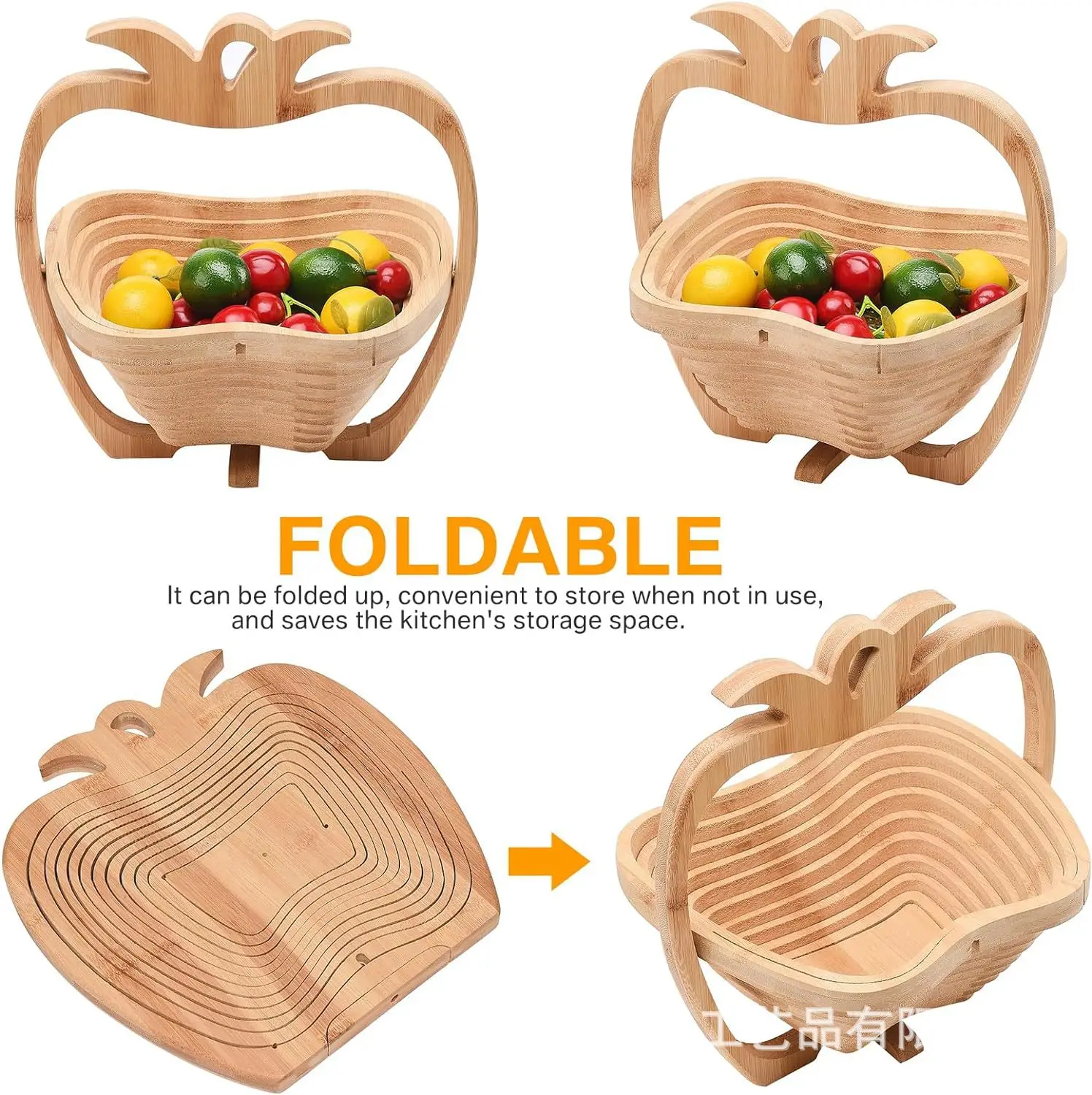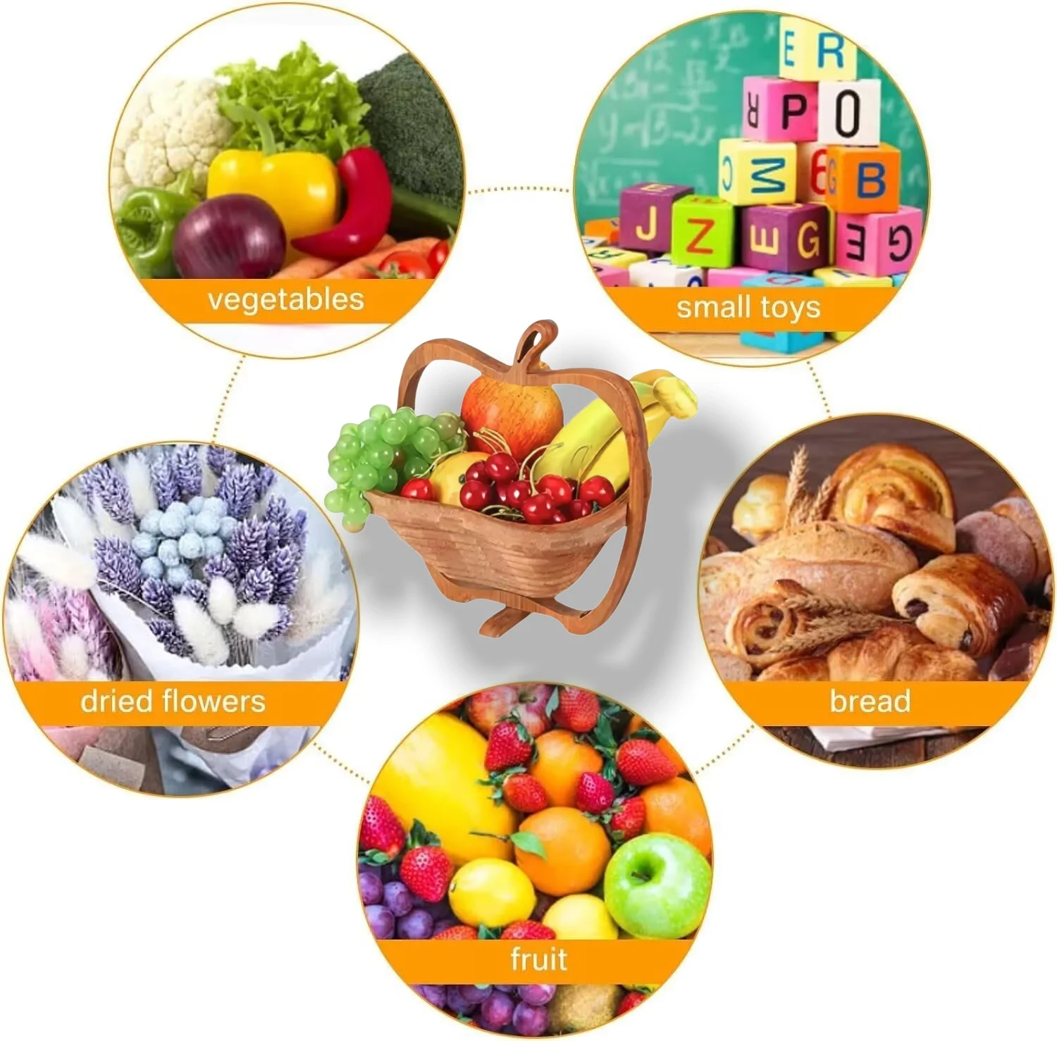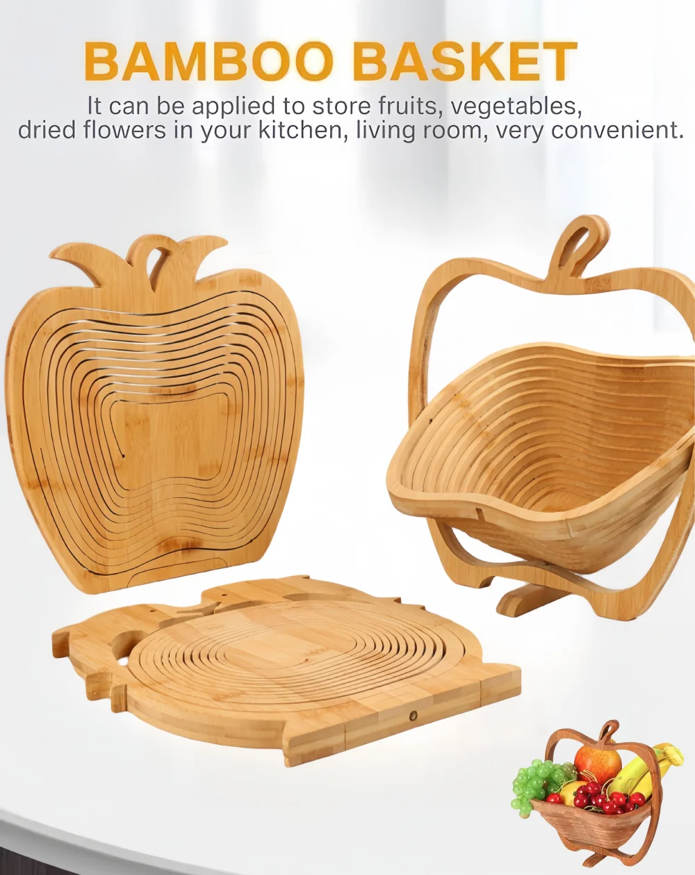 Selain digunakan untuk mempamerkan buah-buahan segar, bakul serbaguna ini juga boleh menyimpan roti, kacang, makanan ringan, biskut, malah peralatan dapur. Dengan kapasiti yang besar dan reka bentuk boleh lipat, ia sesuai digunakan di dalam rumah, untuk piknik luar rumah, jamuan, atau sebagai penyelesaian penyimpanan yang teratur di mana-mana bilik.