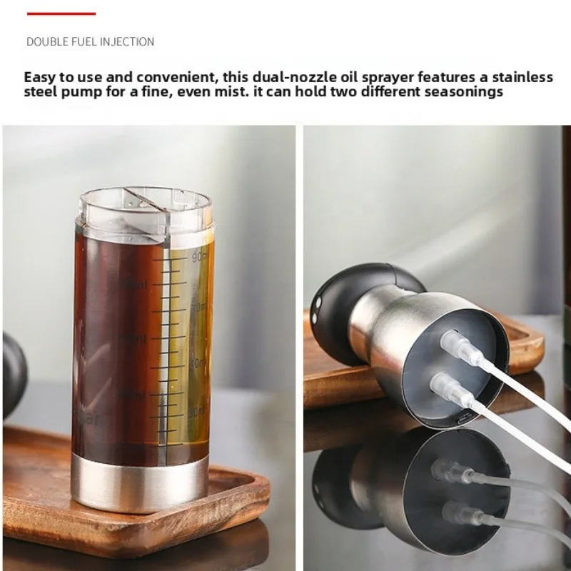 This innovative oil spray bottle features two completely independent chambers for storing different oils or liquid seasonings simultaneously. The separate compartments prevent flavor cross-contamination, allowing convenient alternation between oils and vinegars during cooking.
