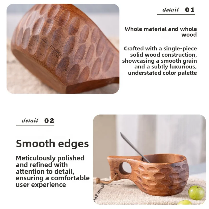 Made from single-piece natural wood with visible grain patterns and hand-polished edges, this dessert cup combines organic aesthetics with functional durability. The smooth, non-porous surface and solid construction offer an eco-conscious alternative to plastic or ceramic serveware.